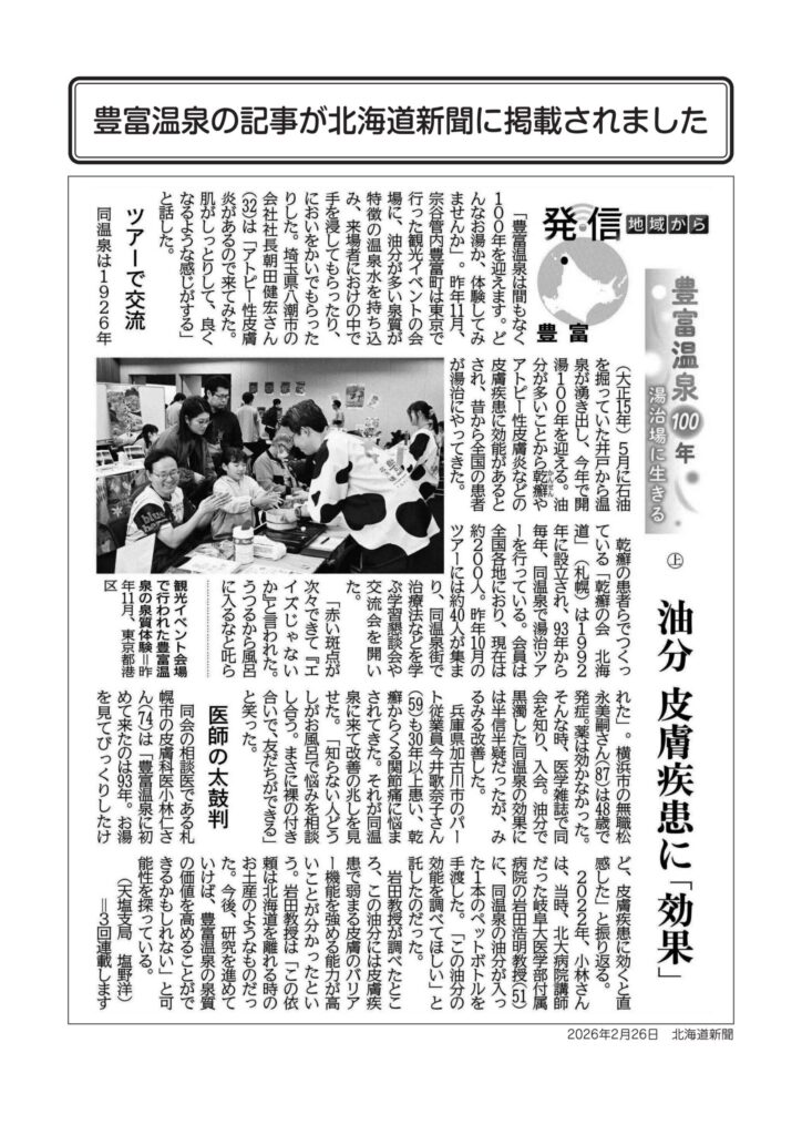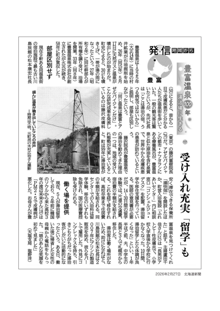 豊富温泉の記事が2026年2月26日~28日の3日間北海道新聞に連載されました。
